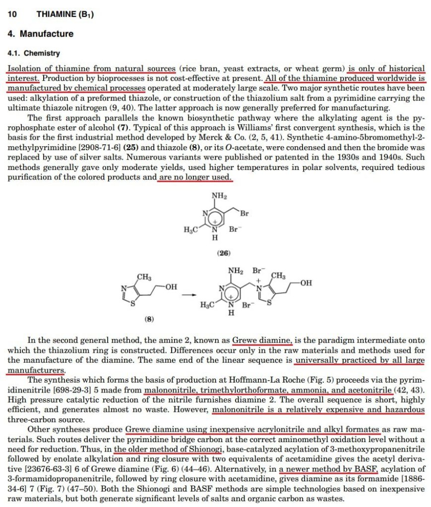Grewe diamine is reacted with chemicals like carbon disulfide (a known neurotoxin used to make perfume, cellophane, rayon, rubber and varnish). Several other chemicals are added to facilitate reactions that yield a substance that is said to be identical to B1 found in food.