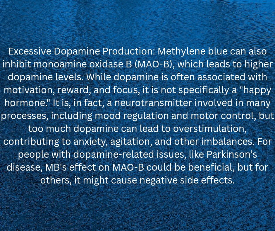 Excessive Dopamine Production: Methylene blue can also inhibit monoamine oxidase B (MAO-B), which leads to higher dopamine levels. While dopamine is often associated with motivation, reward, and focus, it is not specifically a “happy hormone.” It is, in fact, a neurotransmitter involved in many processes, including mood regulation and motor control, but too much dopamine can lead to overstimulation, contributing to anxiety, agitation, and other imbalances. For people with dopamine-related issues, like Parkinson’s disease, MB’s effect on MAO-B could be beneficial, but for others, it might cause negative side effects.