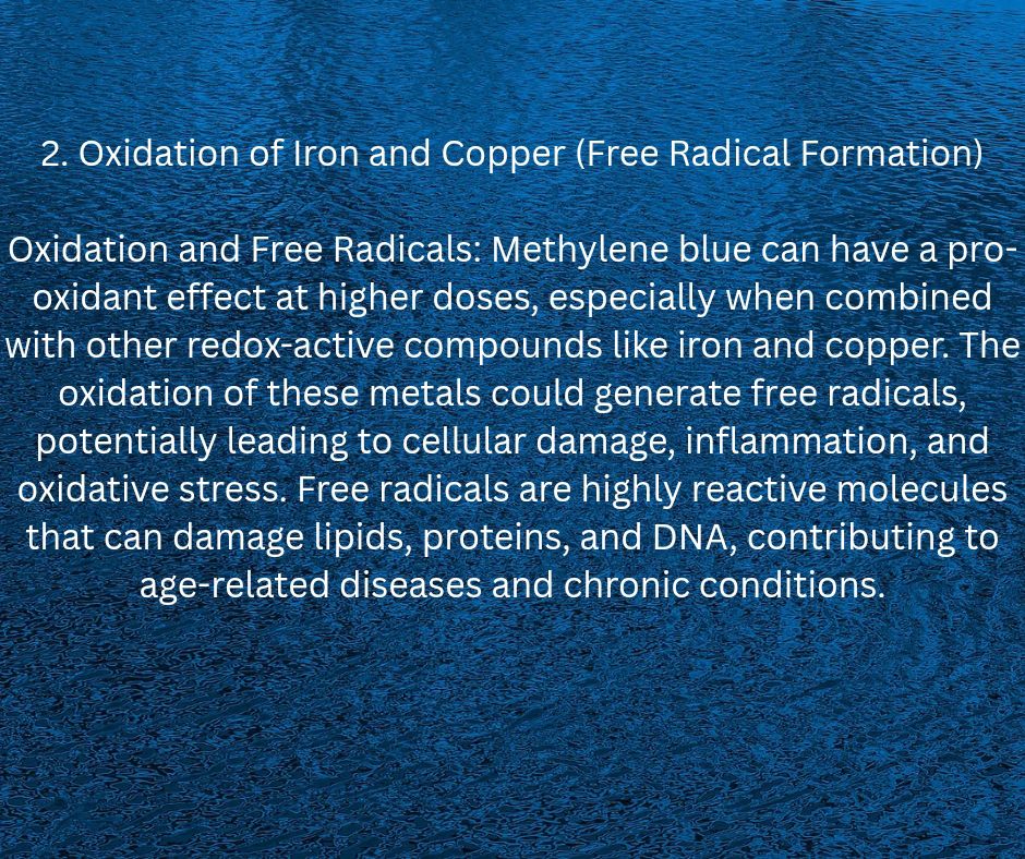 Oxidation and Free Radicals: Methylene blue can have a pro-oxidant effect at higher doses, especially when combined with other redox-active compounds like iron and copper. The oxidation of these metals could generate free radicals, potentially leading to cellular damage, inflammation, and oxidative stress. Free radicals are highly reactive molecules that can damage lipids, proteins, and DNA, contributing to age-related diseases and chronic conditions.