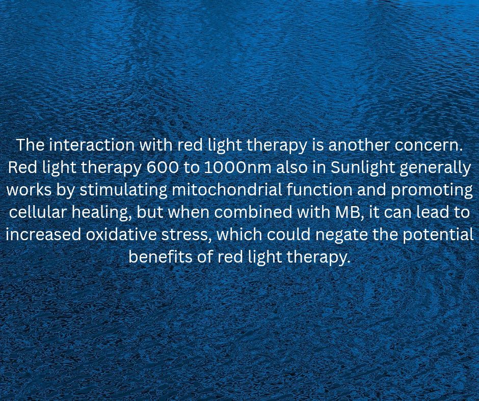 The interaction with red light therapy is another concern. Red light therapy 600 to 1000nm also in Sunlight generally works by stimulating mitochondrial function and promoting cellular healing, but when combined with MB, it can lead to increased oxidative stress, which could negate the potential benefits of red light therapy.