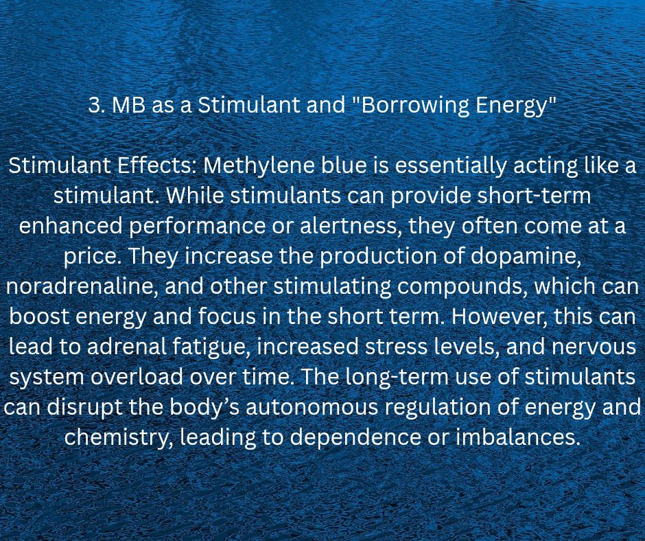 Stimulant Effects: Methylene blue is essentially acting like a stimulant. While stimulants can provide short-term enhanced performance or alertness, they often come at a price. They increase the production of dopamine, noradrenaline, and other stimulating compounds, which can boost energy and focus in the short term. However, this can lead to adrenal fatigue, increased stress levels, and nervous system overload over time. The long-term use of stimulants can disrupt the body’s autonomous regulation of energy and chemistry, leading to dependence or imbalances.