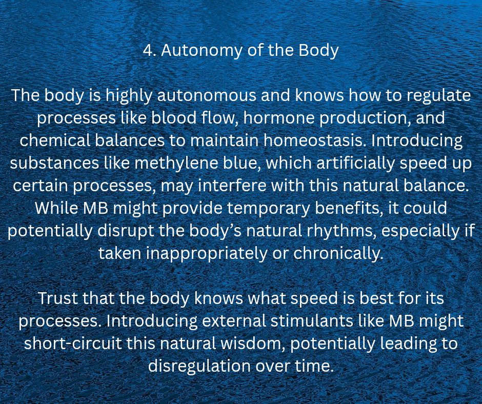 The body is highly autonomous and knows how to regulate processes like blood flow, hormone production, and chemical balances to maintain homeostasis. Introducing substances like methylene blue, which artificially speed up certain processes, may interfere with this natural balance. While MB might provide temporary benefits, it could potentially disrupt the body’s natural rhythms, especially if taken inappropriately or chronically.