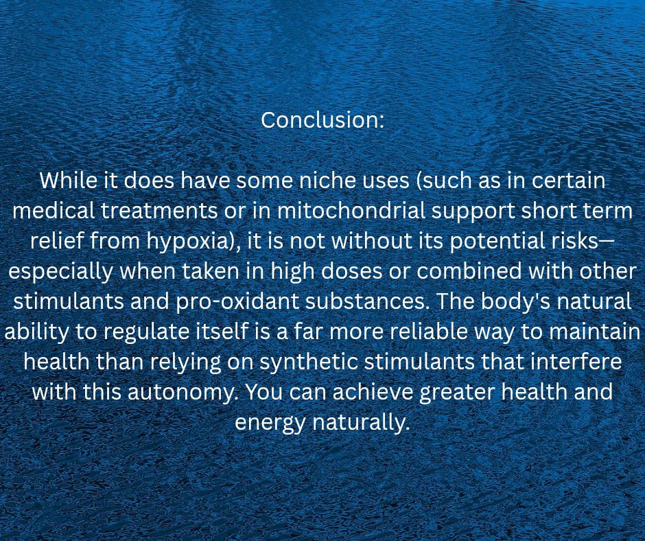 While it does have some niche uses (such as in certain medical treatments or in mitochondrial support short term relief from hypoxia), it is not without its potential risks—especially when taken in high doses or combined with other stimulants and pro-oxidant substances. The body’s natural ability to regulate itself is a far more reliable way to maintain health than relying on synthetic stimulants that interfere with this autonomy. You can achieve greater health and energy naturally.